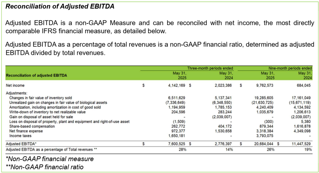 The Company reports its financial results in accordance with International Financial Reporting Standards (“IFRS”). Cannara uses a number of financial measures when assessing its results and measuring overall performance. Some of these financial measures are not calculated in accordance with IFRS. National Instrument 52-112 respecting Non-GAAP and Other Financial Measures Disclosure (“NI 52-112”) prescribes disclosure requirements that apply to the following types of measures used by the Company: (i) non-GAAP financial measures (ii) non-GAAP and other supplementary financial ratios and (iii) total of segments measures. In this news release, the following non-GAAP measures, non-GAAP and other supplementary financial ratios and segment measures are used by the Company are used by the Company: adjusted EBITDA, free cash flow, working capital, segment gross profit before fair value adjustments as a percentage of segment net revenue, segment gross profit as a percentage of segment net revenue, segment operating income as a percentage of segment net revenue, and adjusted EBITDA as a percentage of net revenue. There are no total of segments measures included in this press release. Additional details for these non-GAAP and other financial measures can be found in the section entitled “Non-GAAP and Other Financial Measures” of Cannara’s MD&A for the three and nine-month periods ended May 31, 2025, which is posted on Cannara’s website at www.cannara.ca and filed on SEDAR+ at www.sedarplus.ca. Reconciliations of non-GAAP financial measures and non-GAAP ratios to the most directly comparable IFRS measures are provided below. Management believes that these non-GAAP financial measures and non-GAAP ratios provide useful information to investors regarding the Company’s financial condition and results of operations as they provide key metrics of its performance. These measures are not recognized under IFRS, do not have any standardized meanings prescribed under IFRS and may differ from similar computations as reported by other issuers, and accordingly may not be comparable. These measures should not be viewed as a substitute for the related financial information prepared in accordance with IFRS.